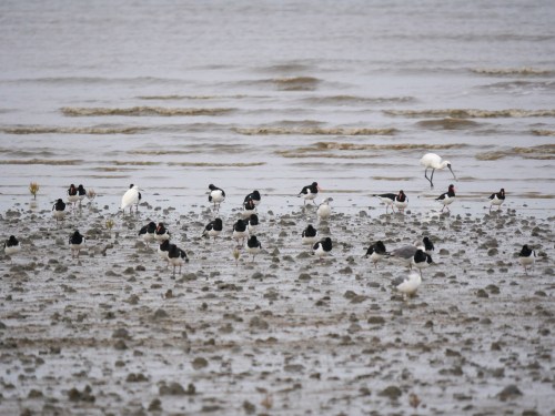 Black-tailed Gulls, Far Eastern Oystercatchers, a Little Egret, and a Black-faced Spoonbill